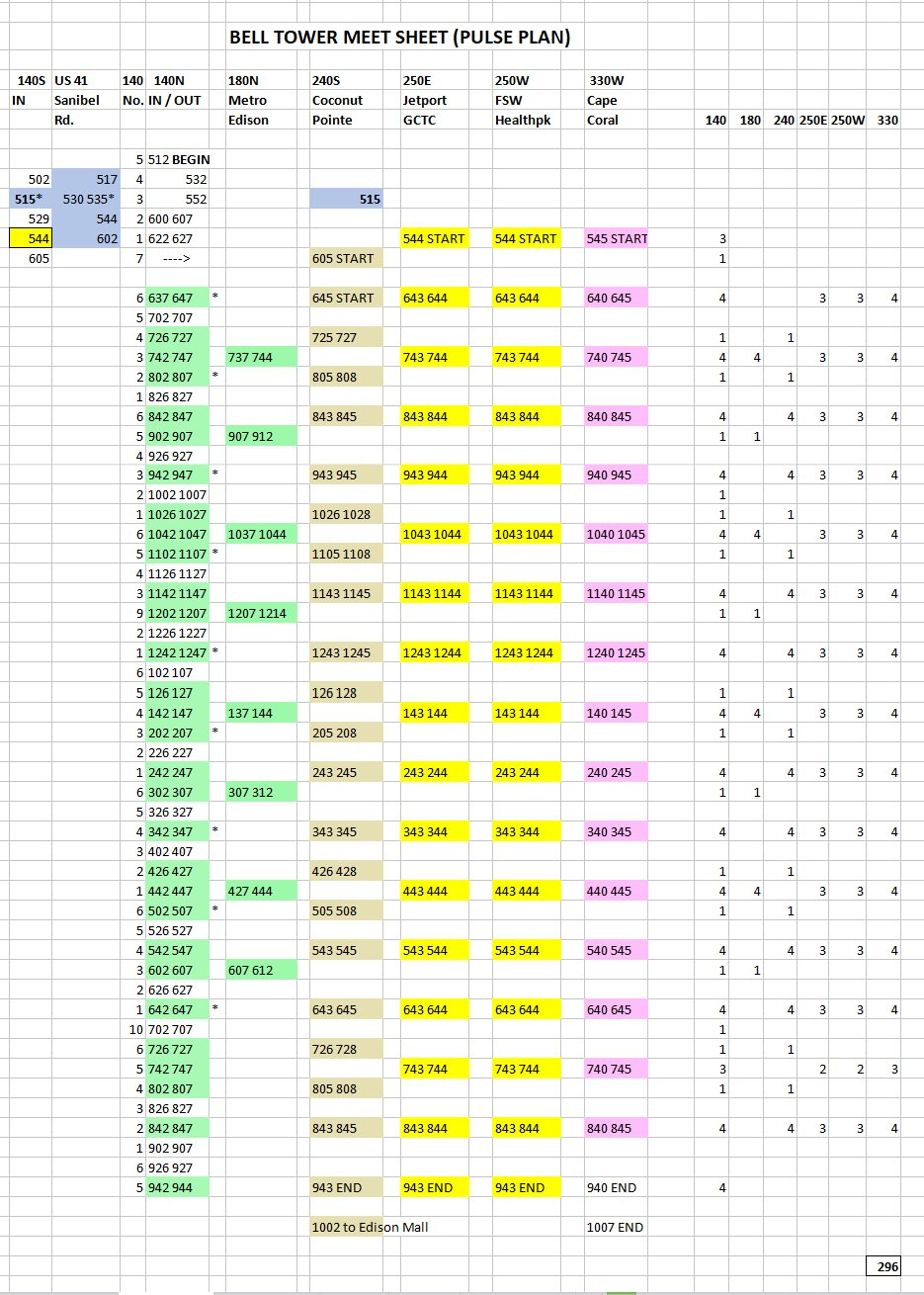 The Bell Tower is the nexus for South Fort Myers, acting as the focal point between the Airport and Beach going east and west, and between Fort Myers and southern Lee County going north and south. Looking at the map, one gets a real insight into how many routes can cooperate to meet up with each other. Passengers should be able to maneuver from one route to another in an expeditious manner, and with the Pulse Plan, they are able to do so. We have the: