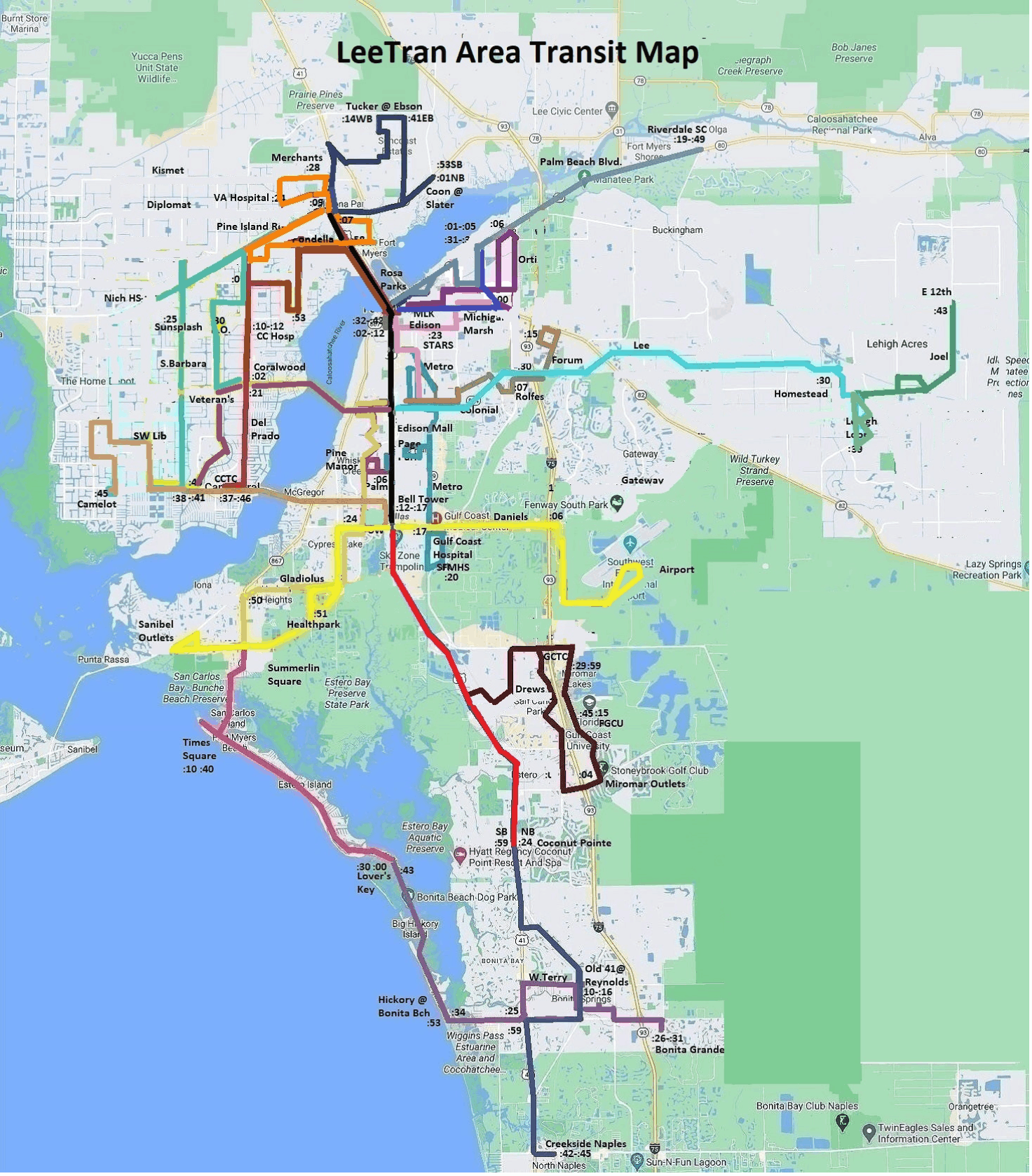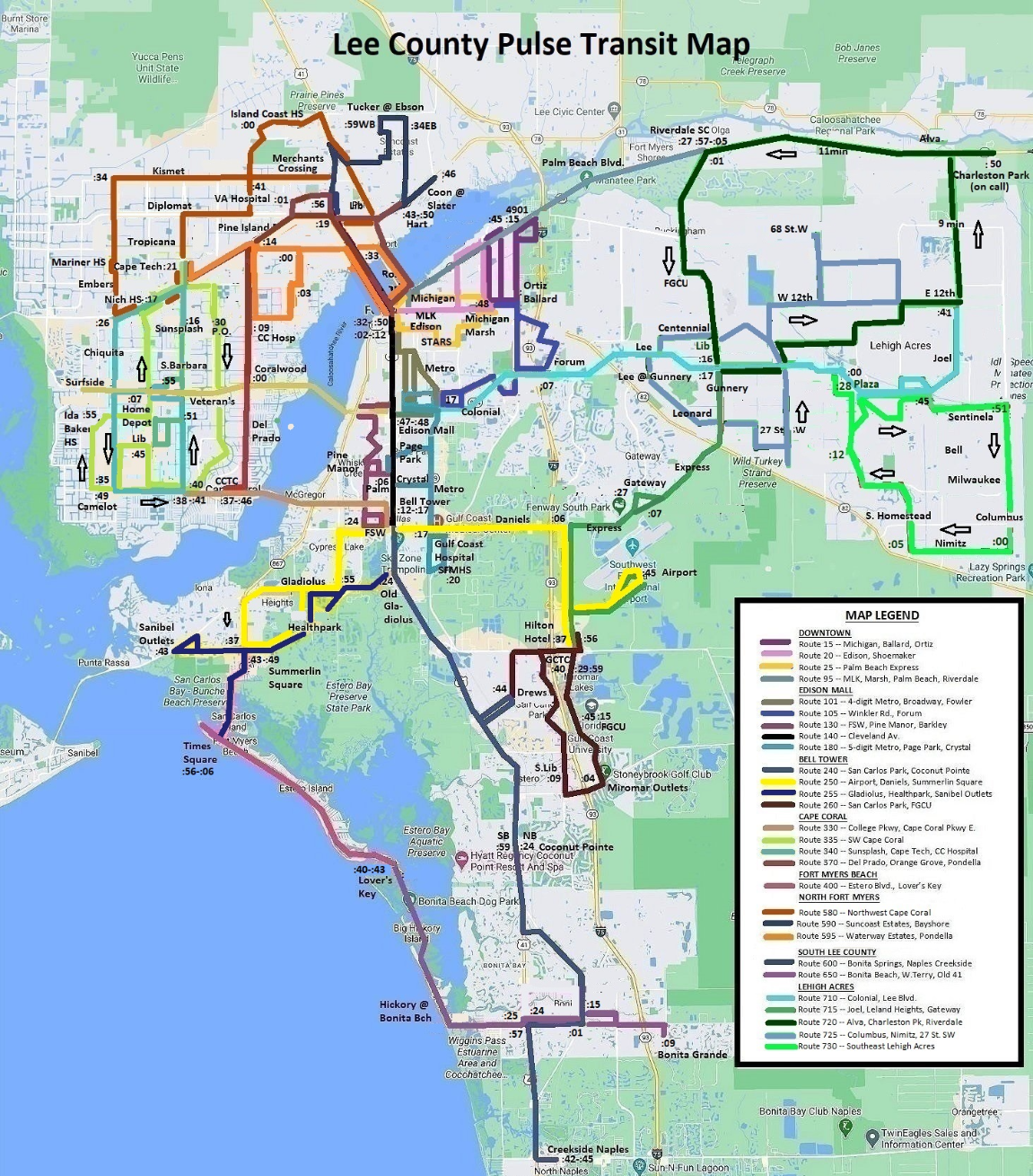 This is an overview of the Pulse Plan System. Since the Timed Transfer Pulse System runs on clockface, buses can be predicted where they will be at any time on the hour on the map. The times on the map are indicated with a colon plus the minute of the hour where the bus will be. Four microtransit routes are also included in this County map -- the 580 Route in North Cape Coral and the 720, 725 sand 730 Routes in Lehigh Acres, serving (720) Charleston Park, Alva, (725) Sunshine, Cemetery, Neal and Leonard Roads and (730) Southeast Lehigh, respectively. All routes run on "clockface," even the microtransit routes!