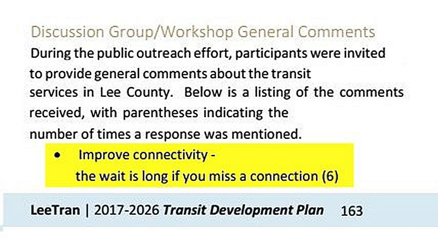 This study was done in 2017, but nothing has been done to correct this deficiency! In fact, the situation has gotten worse in South Lee County when routes were re-aligned in an attempt to match up with the Collier Area Transit. One of the main thrusts of the Pulse Plan to solve this problem of routes not synchronizing with each other!