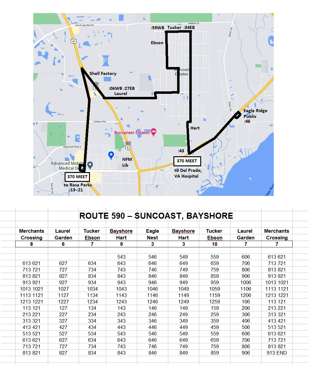 The Pulse Plan has taken over the Tindale-Oliver idea of running the 590 on a 30-minute headway inside Suncoast Estates. In essence, one bus is running two different routes -- an eastbound route inside Suncoast running to Cape Coral and a westbound route inside Suncoast running to Rosa Parks. A thirty-minute headway should prove to be quite convenient to the people of Suncoast Estates.