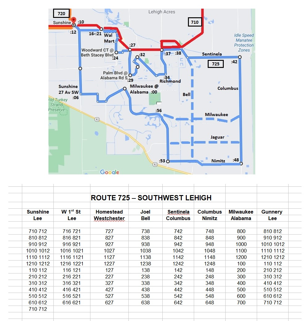 Route 725 is a microservice route which services southwest Lehigh Acres, meeting up with both of the east and westbound 710 Routes near Sunshine Av. at Lee Blvd.